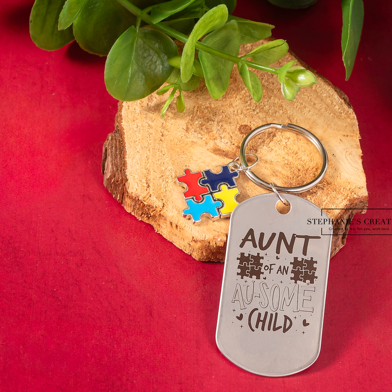 The Aunt/Uncle/Sister/Mom/Dad etc. of an Au-sume Child key ring is the perfect gift for any aunt of a child with autism. The engraved dog tag and rainbow puzzle piece adds a unique touch to this beautifully engraved key ring. Show your love and support for your nephew or niece with this special gift.