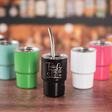 Elevate your festivities with our vibrant stainless steel mini tumbler. Perfect for shots and personalized with fiber laser engraving in a 1.25x1.25" space. Ideal for bridal parties, paint nights, bachelor celebrations, and more. Hand-wash only.